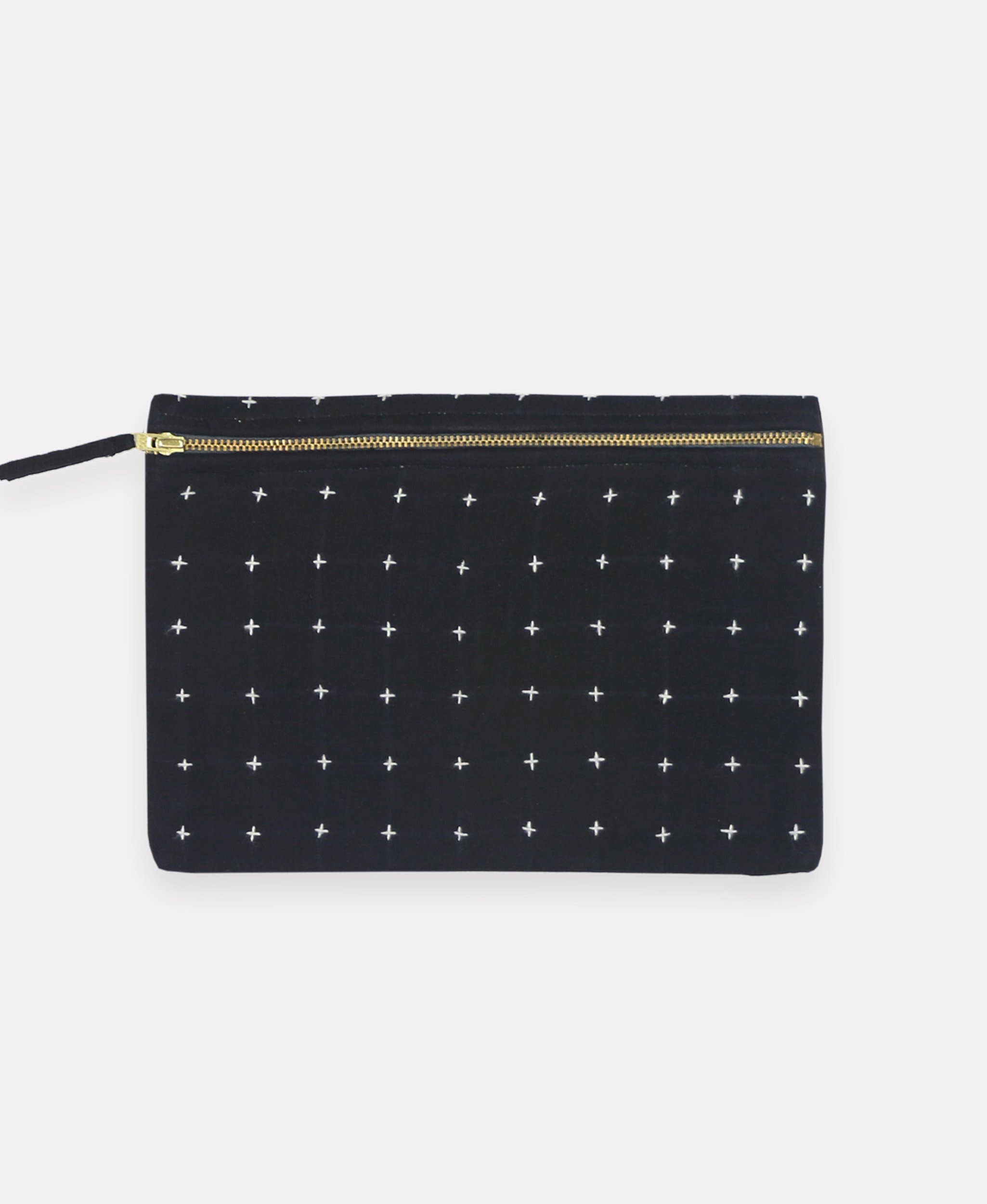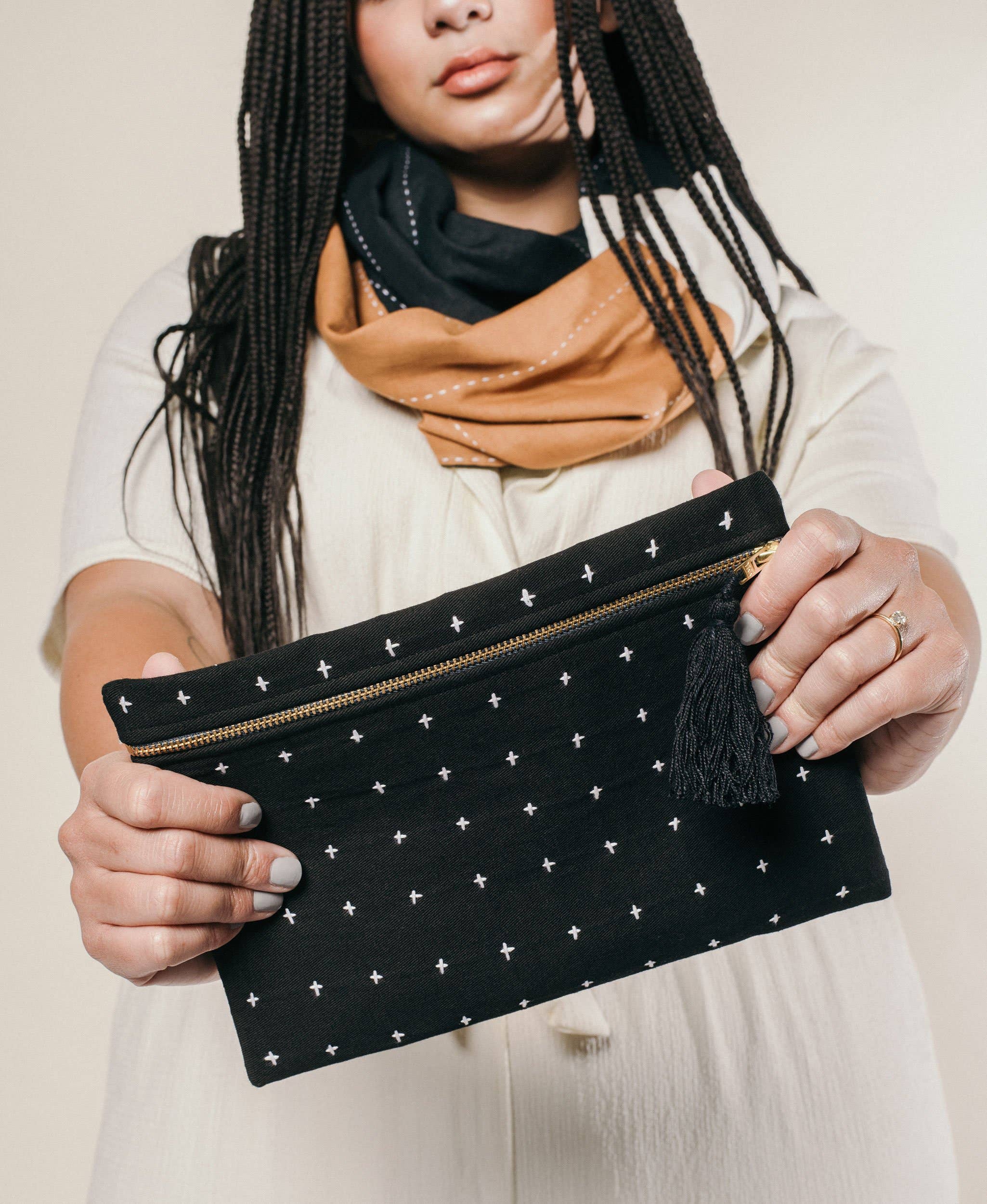 This small pouch showcases charming black-and-white cross-stitch embroidery, a handcrafted tassel zipper pull, and a durable canvas lining. Perfectly sized to hold your essentials, it doubles as a stylish clutch to complete your outfit. Product Details: • Size: 7”H x 10”W • Materials: 1 layer of 100% organic cotton twill, canvas-lined interior, lead-free YKK gold-tone metal zipper closure • Dyed with non-toxic & low-impact AZO-free dyes • Handcrafted by a skilled woman artisan in Ajmer, India • Features the hand-stitched signature of the maker on the tag