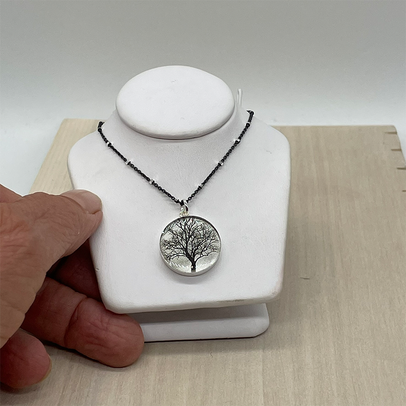 Each image is hand printed on sterling silver with a protective resin lens.
