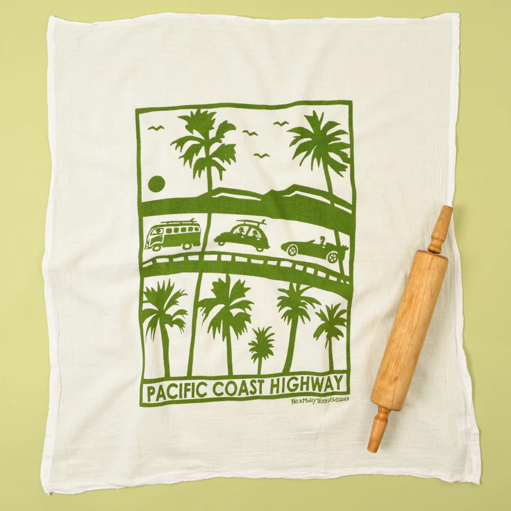 Picture yourself driving along the Pacific Coast Highway with its winding road bordering the sea on one side and hugging the cliffs on the other. Feel the salty spray coming in through your car window and catch a glimpse of a sealion or a whale! This icon of American road culture is a must-see for anyone venturing to the West Coast. This fun towel features palm trees swaying in the breeze and families caravanning along in search of new adventures! If you're ever out our way, our store is just two blocks from PCH and half a block from the beach! Seal Beach is nestled in snuggly along PCH just South of Los Angeles. We'd love to see you!