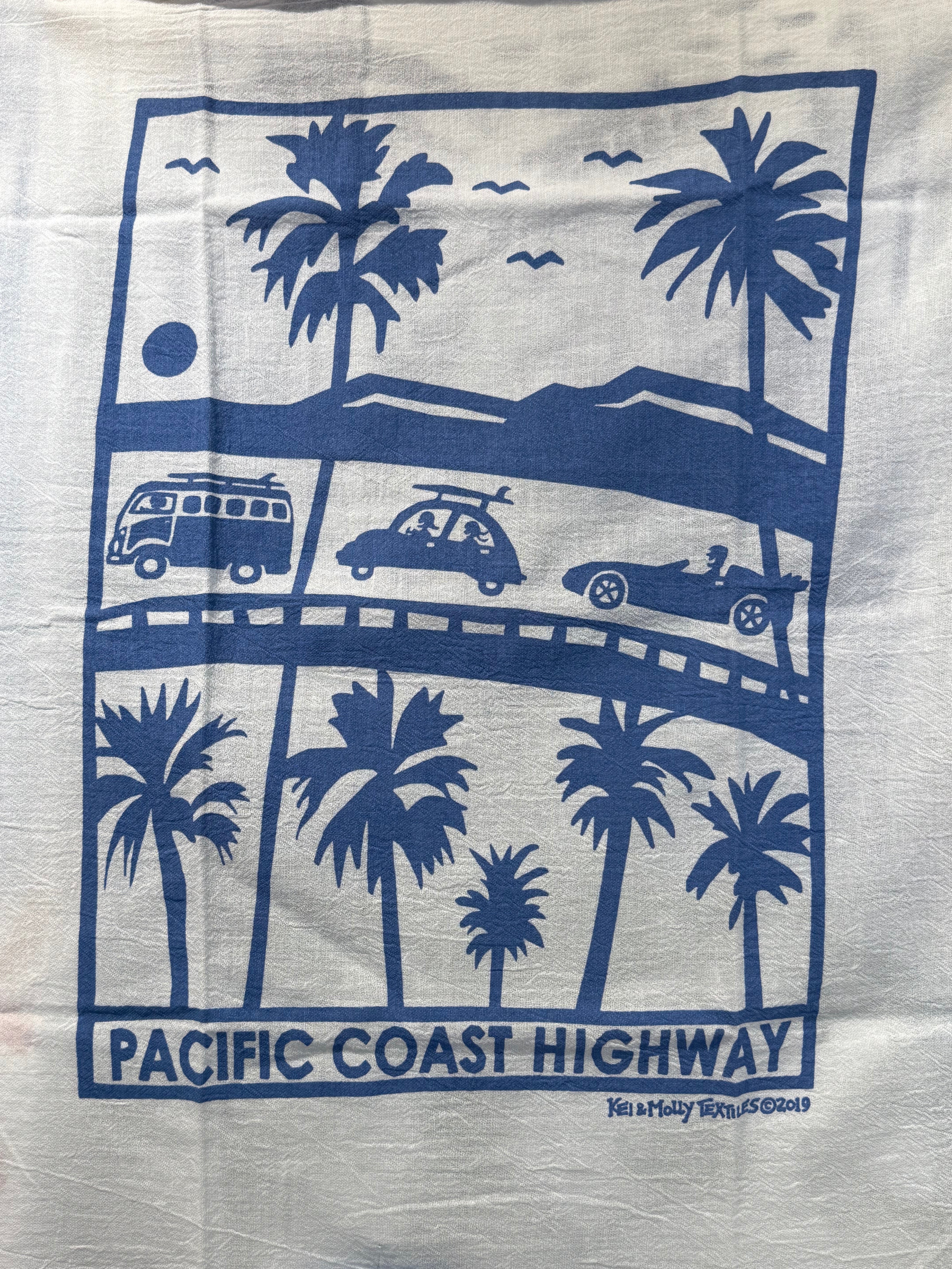 Picture yourself driving along the Pacific Coast Highway with its winding road bordering the sea on one side and hugging the cliffs on the other. Feel the salty spray coming in through your car window and catch a glimpse of a sealion or a whale! This icon of American road culture is a must-see for anyone venturing to the West Coast. This fun towel features palm trees swaying in the breeze and families caravanning along in search of new adventures! If you're ever out our way, our store is just two blocks from PCH and half a block from the beach! Seal Beach is nestled in snuggly along PCH just South of Los Angeles. We'd love to see you!