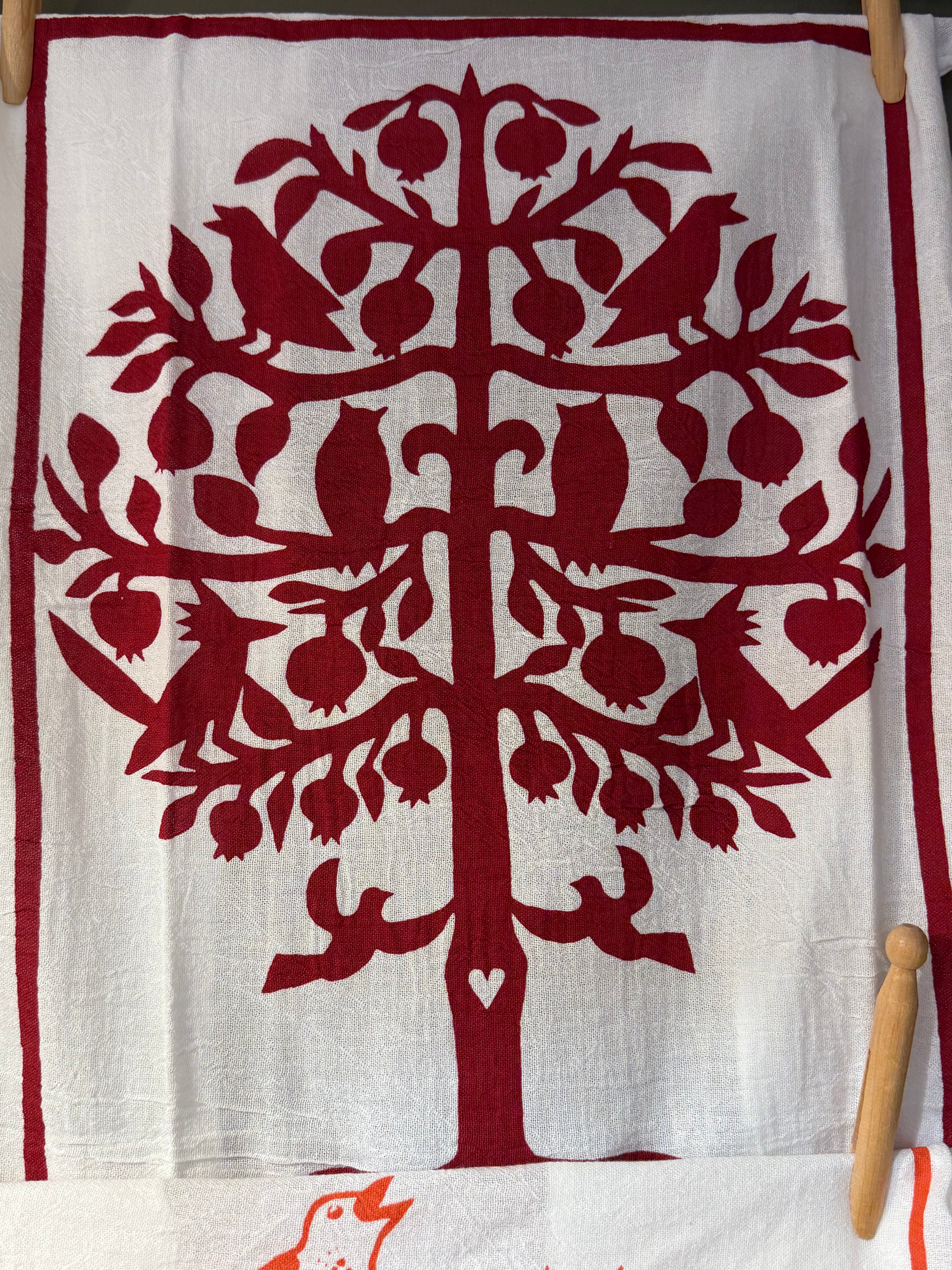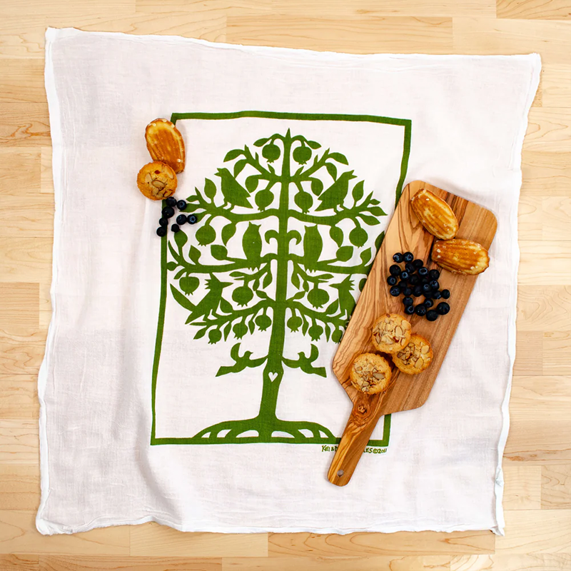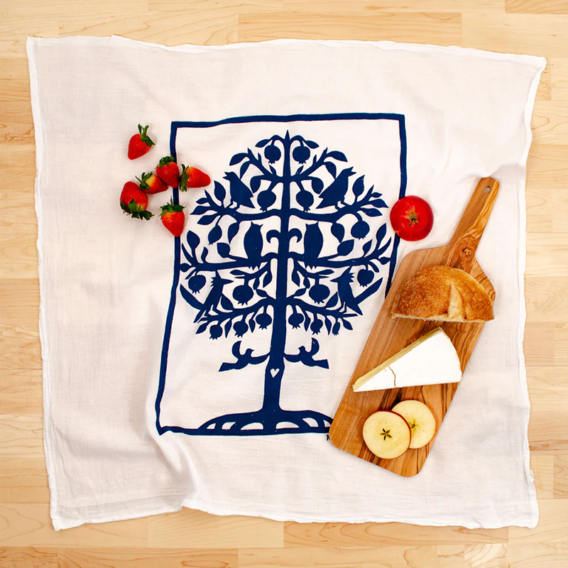 One of the most popular flour sack dish towel designs is the Tree of Life. This design was created as a true paper cut, from a single piece of paper! The image of the Tree of Life exists in religion, myth, and philosophy, in most countries and has a wide variety of meanings. No matter what it may mean to you, the simplicity of the pomegranate tree filled with birds, carved with a heart is a meaningful gift for any occasion.