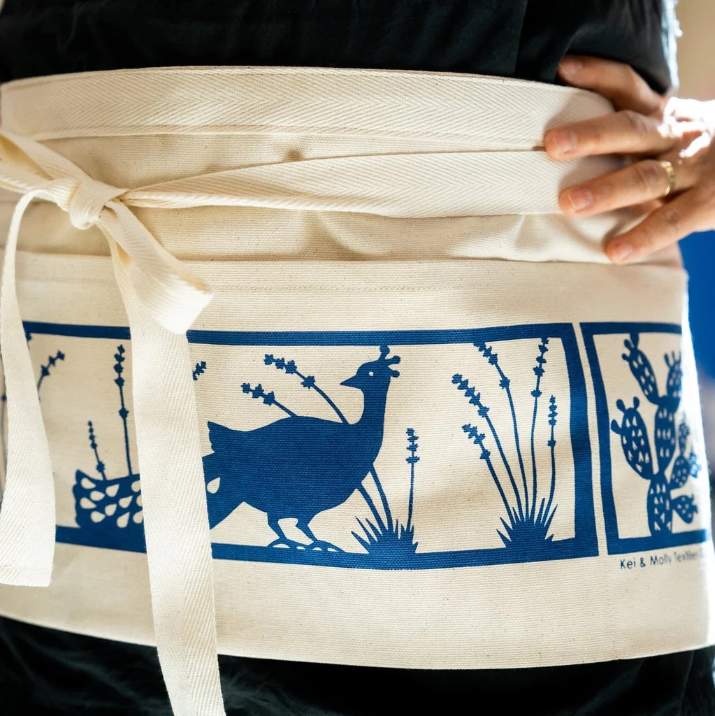 Both functional and versatile, our new 100% cotton canvas waist aprons are perfect for everyone - the gardener, artist, teacher, or market vendor. We love wearing these when we sell at grower's markets and art fairs to hold our cash and market essentials! Each apron has two smaller side pockets (perfectly sized for your cell phone or sunglasses) and a larger central pocket. Cut, sewn, and printed in Albuquerque. Get one for yourself or for a friend!