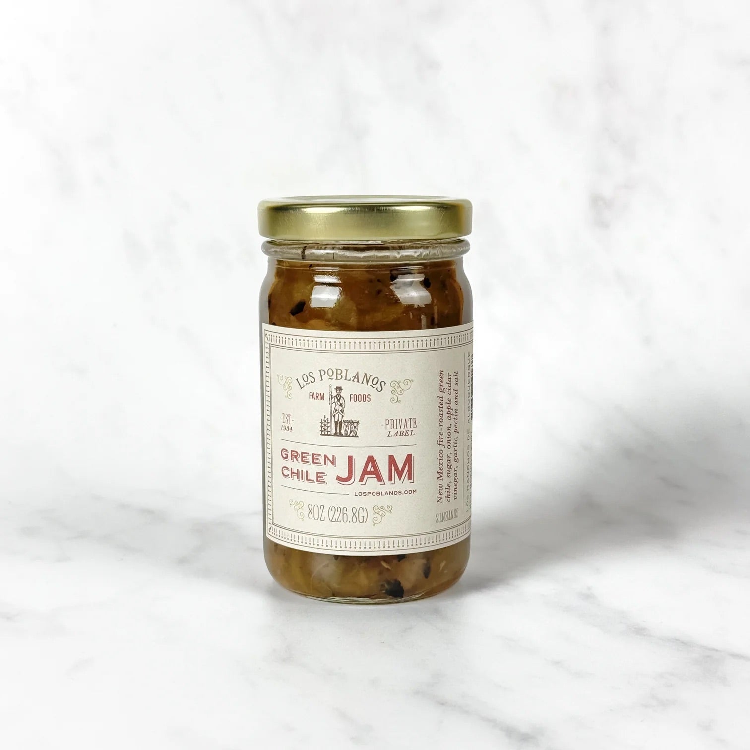 Green Chile Jam is a much-loved classic at Los Poblanos. Featured on the menus at our restaurant, this jam brings a sweet heat to dishes like avocado toast and charcuterie boards. Fire-roasted green chiles are balanced with sugar and apple cider vinegar to highlight this iconic New Mexican flavor in a unique way.