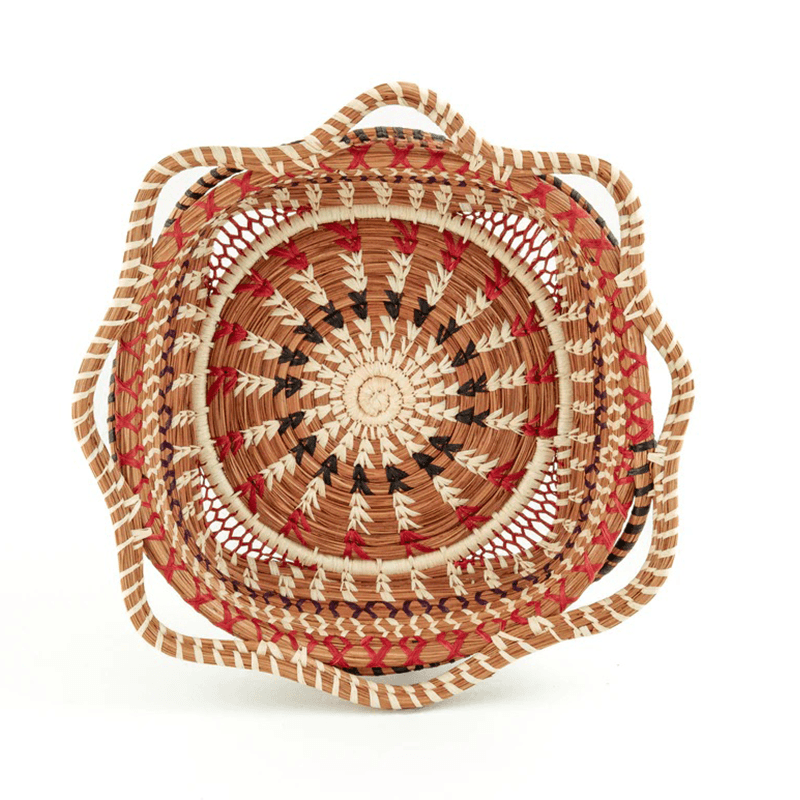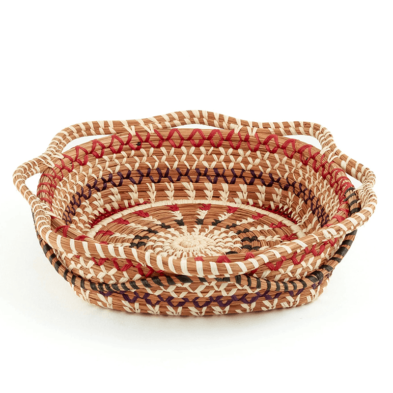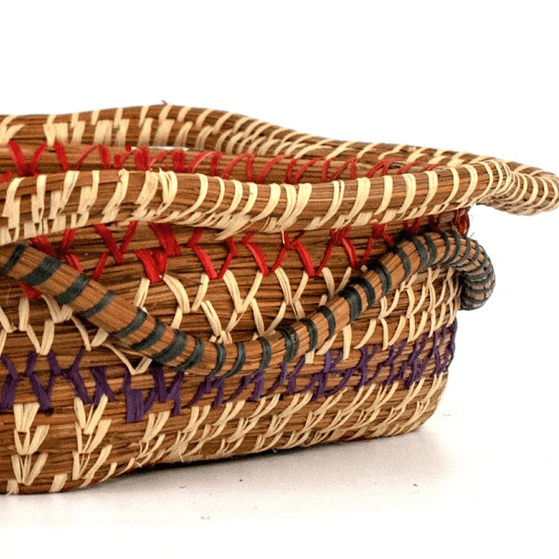 Intricately woven Butterfly Basket, a fabulous creation from Mayan Hands basket weavers, has red, purple and green raffia accents and a graceful undulating decorative trim. It displays beautifully on a shelf - but be sure to take it down and use it, too! This basket is a collectors' favorite.