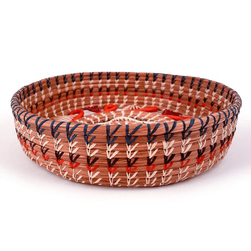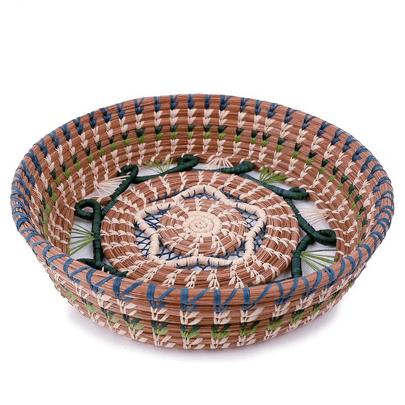 Update your home décor with the Cristina Basket in Green! Featuring intricate green loop detailing and accented by a star-shaped center, this stunning basket will shine as part of your table setting or a basket wall. Pops of green and blue stitching accent this eye-catching centerpiece. Designed by our artisan partners in Guatemala, the complexity of this basket showcases their profound skill and creativity. Handcrafted from pine needle and raffia.