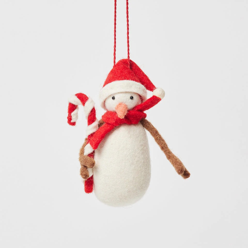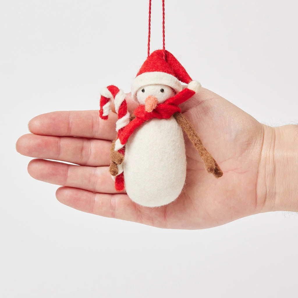 Our Candy Cane Snowman ornament loves to roam his candy cane forest! He has selected this special one just for you! This soft hand felted snowman looks lovely hanging on the tree, tied to a gift or on a box of homemade cookies.