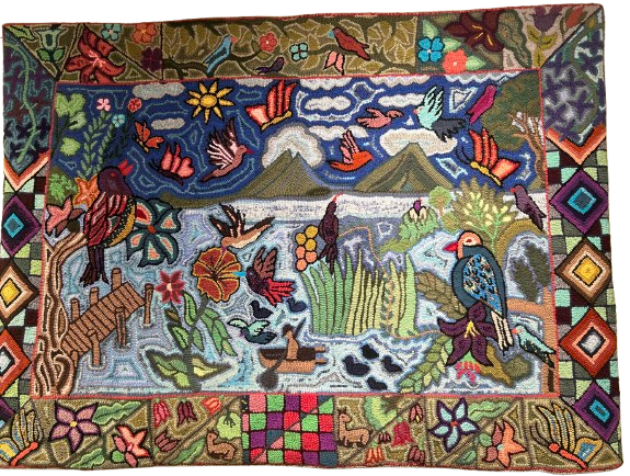 AMAZING one-of-a-kind narrative rug depicting typical farm life in Guatemala. Multicolores hooked rug made from 100% recycled materials. Each piece is a one-of-a-kind artwork and is labeled with the name of the artist and the number of upcycled garments used to make it. Approximately 36" x 60"
