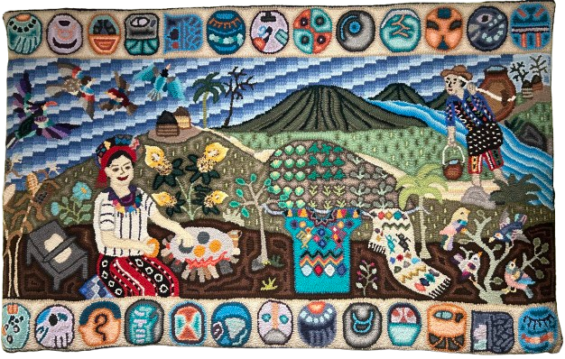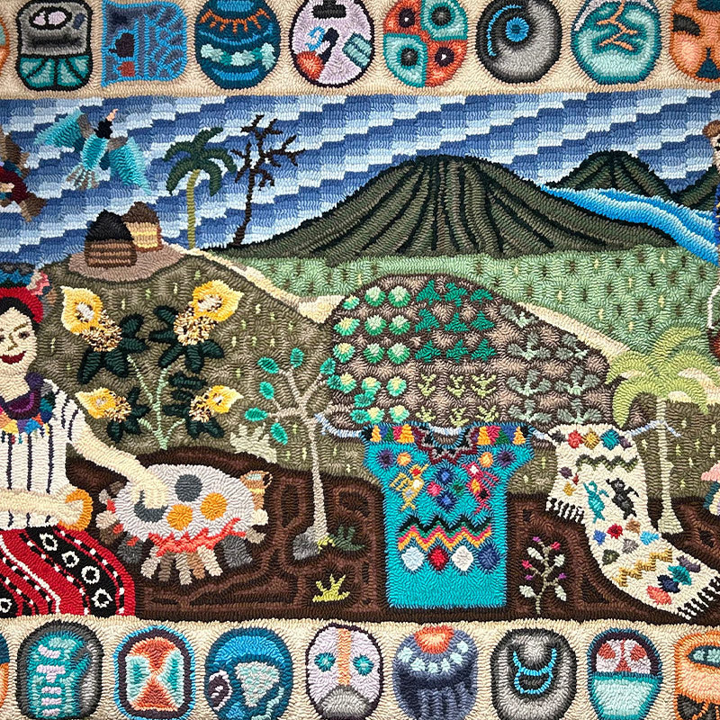 AMAZING one-of-a-kind narrative rug depicting typical life on Lake Atitlan. Multicolores hooked rug made from 100% recycled materials. Each piece is a one-of-a-kind artwork and is labeled with the name of the artist and the number of upcycled garments used to make it. Approximately 48" x 72"