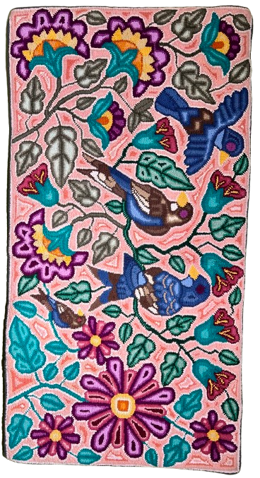 Multicolores hooked rug made from 100% recycled materials. Each piece is a one-of-a-kind artwork and is labeled with the name of the artist and the number of upcycled garments used to make it. Approximately 24" x 48""