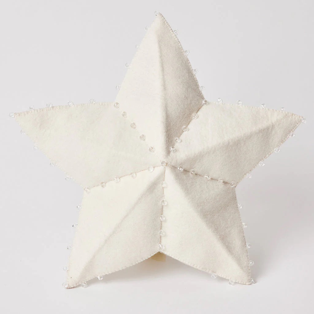 Our gorgeous White Star Topper brings all the star light! This felt beauty is the perfect finishing touch for your tree. Delicate clear beads trim the edges and the bottom opening is lined on the inside, making it easy to use.
