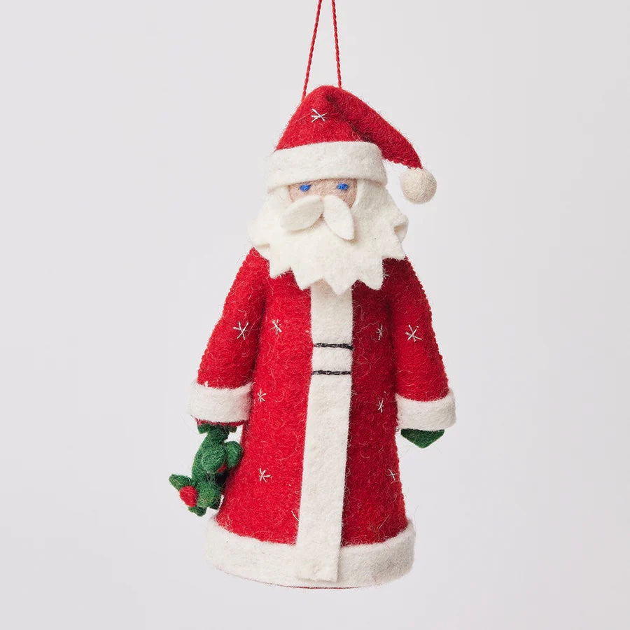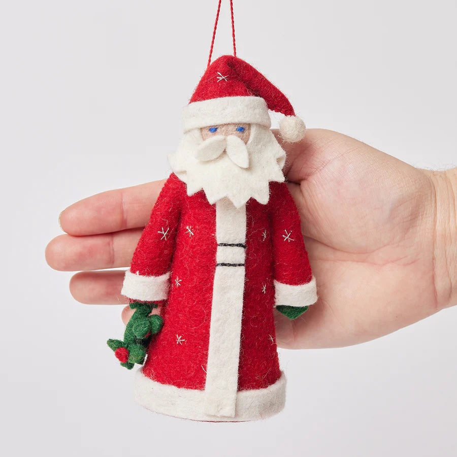 This crimson felt Father Christmas carries a gift of winter beauty. A branch of mistletoe and a cloak of stars, he brings the spirit of winter and Yuletide wherever he goes. He looks wonderful on a mantle, bookshelf or a tree!