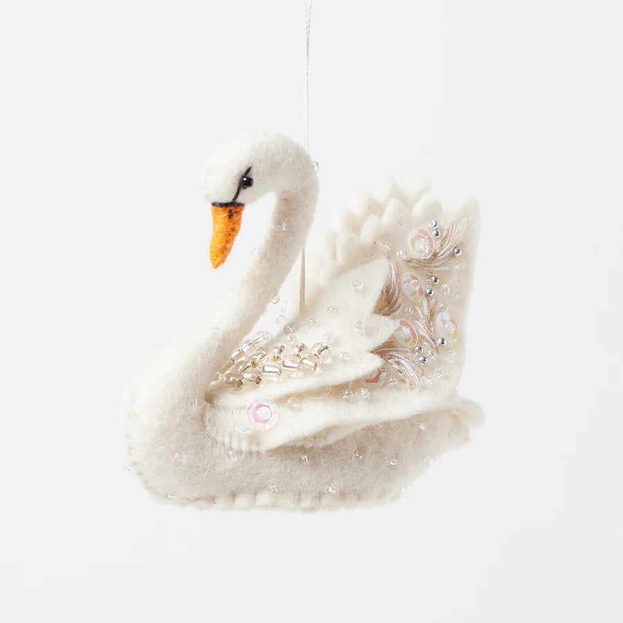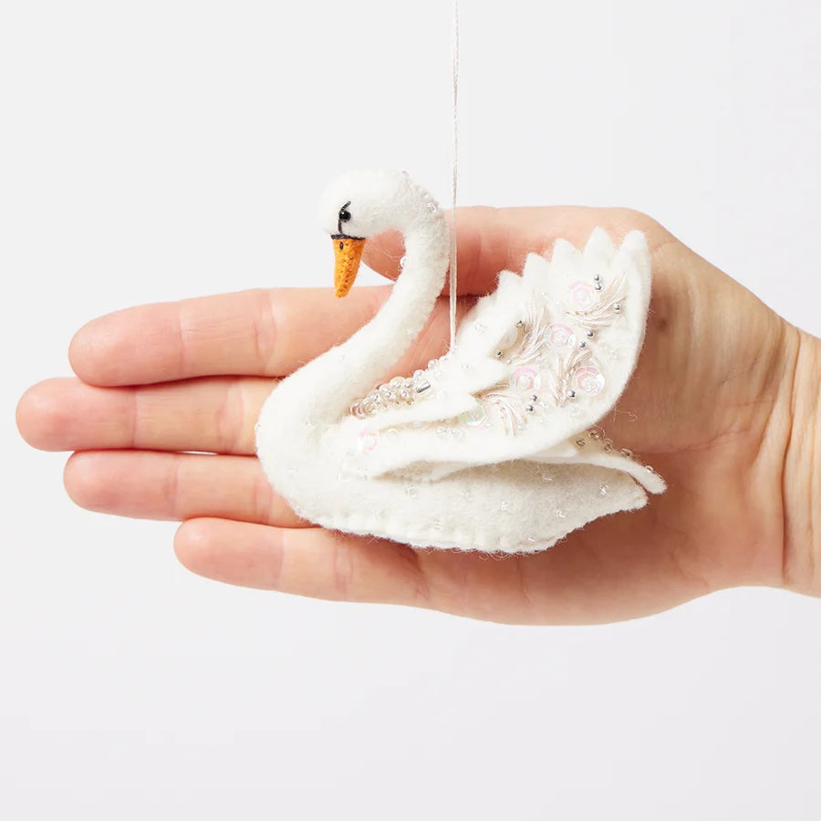 With her filigree embroidery and beading, our lovely shimmer swan ornament will dance you away to the magical land of the sugar plum fairies. A classic for the holiday season, she looks lovely tied to a gift of ballet ticket, or a pair of dancing shoes. Also a classic on the tree!