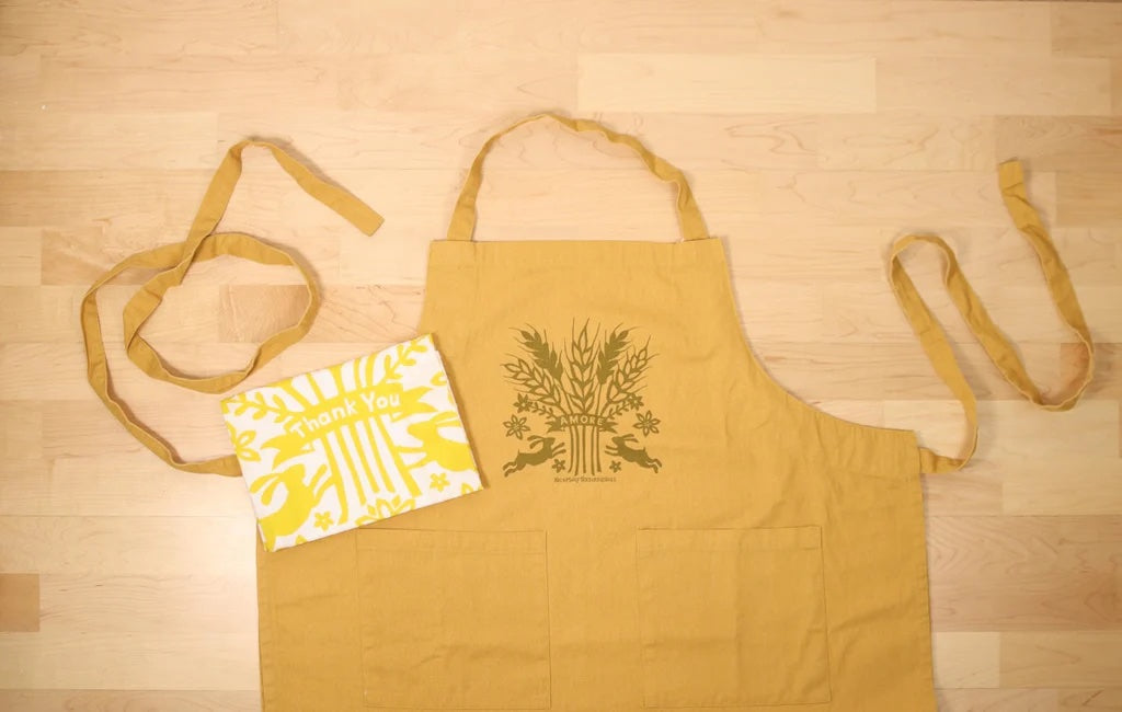Hand-printed in Albuquerque, NM, USA using water-based, eco-friendly inks on aprons imported from India (Danica brand)