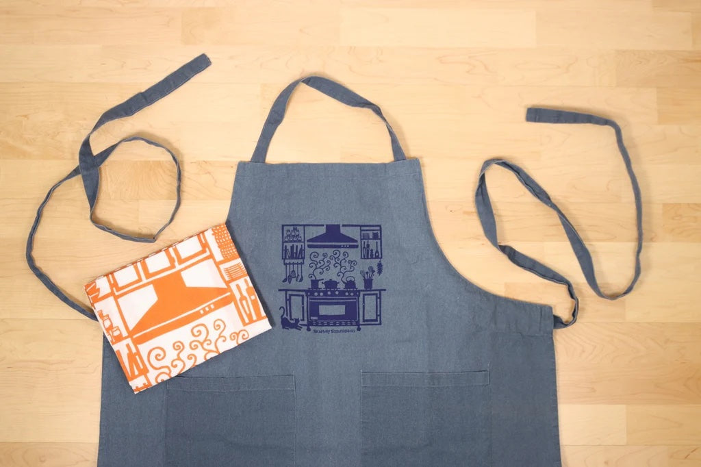 Hand-printed in Albuquerque, NM, USA using water-based, eco-friendly inks on aprons imported from India (Danica brand)